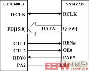 GPIF是FX2的端点FIFO的片内控制器,可以完全代替片外的控制器而实现FX2与外围FIFO的“无胶”连接。GPIF的核心是一个可编程状态机,可以产生六个“控制”(CTL)和九个“地址”(GPIFADR[8:0])信号,可以接收六个外部(RDY)“准备好”输入,八位或者十六位数据总线,时钟可以用FX2的IFCLK,也可以由外围提供。本文GPIF接口的详细硬件连接如图2所示。