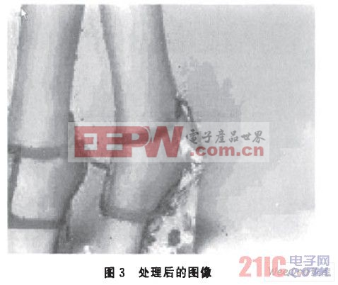 而如果存在噪点,那么在原图像素和噪点之间的灰度值会发生突然的变化。基于此,首先取待检测点的上、下、左、右四个邻域大小为3×3,计算各邻域的平均值,如果四个邻域的均值都与待检测点的差的绝对值大于既定的阈值,则判断该点为噪点,反之,有一个邻域的均值与待测点的差小于阈值。则判断该点为正常像素点。其中;阕值是我们根据图像的含噪情况人为设定的一个值,一般在100和200之问。同时。建立与待检测图像大小相同的矩阵,称为噪声标识矩阵。其中的点与原图像矩阵中的点一一对应。并预设该矩阵中的值全为1,如果一像素被判断为噪声,则置标识矩阵中相应元素为o.这样,就可以实现前面判断过程所得出的结果被后续的检测所使用,已经被判定为噪声的像素不再参与领域均值的计算。 这样,我们就可以用一个循环,来对图像矩阵中的每个像素逐个进行判断,方便地检测到了噪声点。 接下来,就可以利用中值滤波的方法,去除图像中的噪点了,将预先判断为噪点的图像矩阵中的点,如(a。b)=(70.S5)的点的值是230,与邻域点的均值的差大于两值150。因此翔断它是一个噪点。这样,我们就用它邻域内的八个点中有效的点来取均值代入。依次执行,挨个计算、代人。这样就得到了一个新的图像数据矩阵,最后我们用i眦Ilow函数显示处理后的图像(见图3)。可以看到。效果非常明显。 4 结语 去噪后的图像不仅噪声强度受到限制,而且图像细节得到了最大限度的保持,解决了妨碍人们获取图像信息的同胚。在航空航天、通信工程、生物医学、军事公安、文化艺术等领域都具有一定意义。