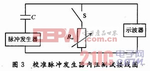断开图3中开关S,将被检校准脉冲发生器输出脉冲通过电容C接到示波器的输入端,读出示波器显示的电压波形峰值Up,将开关S合上,调节可变电阻器Rw,使示波器显示的电压波形峰值降为Up/2。此时可变电阻器Rw的值即为校准脉冲发生器的内阻值。本项目的研究发现,上述标准的规定是不能准确测量内阻的。这是因为校准脉冲信号发生器所发生的信号是频率为1 000~1 200 Hz的方波,其上升时间小于等于