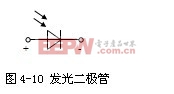 发光二极管的符号如图4-10所示。它的伏安特性和普通二极管相似,死区电压为0.9~1.1V,其正向工作电压为1.5~2.5V,工作电流为5~15mA。反向击穿电压较低,一般小于10V。