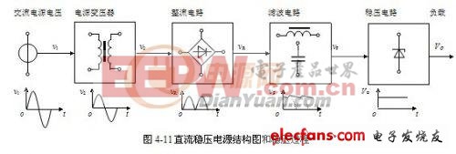 电路中,通常都需要电压稳定的直流电源供电。小功率稳压电源的组成可以用图4-11表示,它是由电源变压器、整流、滤波和稳压电路四部分组成。