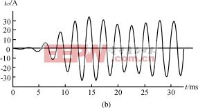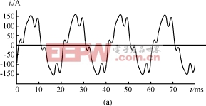 下面以三相可控桥整流电路为对象,假设电源电压对称且无畸变,电流含有5次、7次谐波,控制角为30°,如式(16)所示。电流ia如图7(a)所示。采用基于pq运算方式的五次谐波检测方法得出的ia5波形如图7(b)所示。