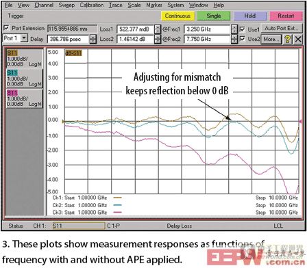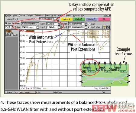 图4表示了平衡到不平衡5.5GHz无线本地网(WLAN)滤波器测试到10GHz的响应。表示了在自动端口扩展工具栏内,测试设备之一的端口延迟和损耗项。该值由安捷伦PNA网络分析仪自动计算。下面的两个轨迹表示了没有端口扩展的DUT测量。没有端口扩展,测量包括了DUT和测试设备。失真响应是由于没有相位补偿(尤其重要的是对平衡端口),并没有对PCB上该传输线的损耗进行补偿。具有端口扩展,严重误差由于测试设备被去除,并为WLAN滤波器的实际性能提供了相当高的精度。