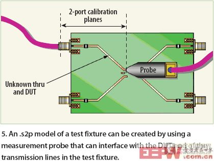 创建测试设备.s2p模型的最简单方式就是采用测量探头,其可以与该测试设备中传输线的DUT端点实现接口(图5)。这种情况下,用户在测试设备一侧实现了一个使用同轴标准的未知的通过校准,并使用了测试设备另一侧的探头阻抗标准基板(ISS)。测试设备的传输线是未知的路径。经过校准后,测试设备只被简单测量,并未移动探头或同轴线缆。测量过程对测试设备的每个部分反复进行,使用与第一个设备相同的校准。为了用探头来测量传输线端点,接地平面必须放在与测试探头的节距间有正确间距的测试设备上。