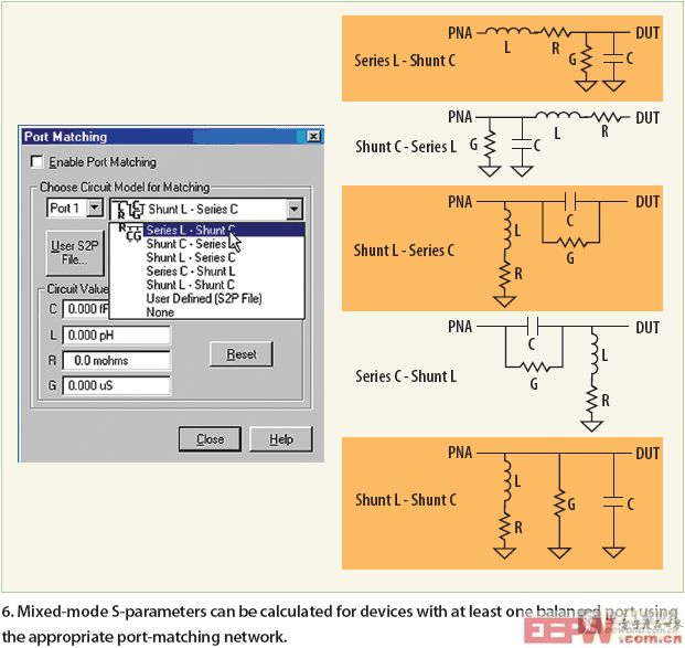测试设备去嵌入准确的反面是测试设备嵌入。如果网络可以从测量中精确减去,其可以很容易地被添加到测量中也是合理的。VNA在50欧姆单端环境中匹配来实现S参数。当测量设备不符合这一类别时,需要对该数据进行进一步处理。许多这些软件设备工具被内建到安捷伦科技的PNA和ENA矢量网络分析仪中。对于非50欧姆的设备,有可能重述S参数数据,以便它看起来像使用VNA阻抗测量DUT,而非50欧姆。也有可能嵌入虚拟阻抗匹配电路,这往往需要例如声表面波(SAW)滤波器等设备,而不必真向测试设备中增加电感和电容。可以对设备计算混合模式(微分,共同和交叉模式)S参数,至少有一个平衡端口。图6表示了部分常见的阻抗匹配网络内建到用于这一目的的VNA中。