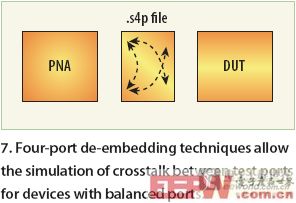 对具有平衡端口的设备,4端口去嵌入允许测试端口之间的串扰仿真(图7)。尽管当使用同轴线缆时,串扰是微不足道的,但当测试设备或探头用于测量时有可能变得显著。使用两个二端口.s2p文件将比使用单一的四端口文件提供不同的测量结果,这是因为串扰项也不会包括在两端口文件内。