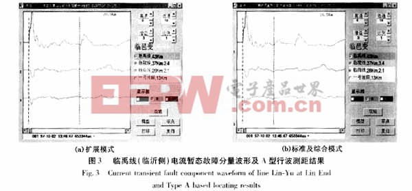 1997年10月2日13时46分47秒,山东德州电业局所管辖的110 kV临禹线(全长43 km)发生B相接地故障,其中临邑侧含故障线路在内同母线上3条线路的故障相电流暂态故障分量波形如图3所示,可见该波形较为复杂。仔细分析可以发现,在故障距离为26.9 km处存在由来自故障方向行波浪涌引起的波头分量,其初始极性与故障初始波头分量的极性相反,但二者很快变为同极性,因而必为线路对端母线反射波所引起,而且对端母线必为第2类母线,从而可以直接获得扩展模式下的测距结果为26.9 km,如图3(a)所示。标准和综合模式下的测距结果可以间接获得,并且近似为(km)。从故障线路电流暂态分量波形中可以发现,在对应于该近似位置的邻域内距离本端16.5 km处存在由来自故障方向行波浪涌所引起的暂态波头分量,如图3(b)所示,从而可以将标准和综合模式下的测距结果修正为16.5 km。实际故障点位于距本端16 km处(线路中点以内)。