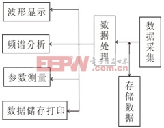 本虚拟软件将有关测试功能集成在一个面板上,这里着重介绍LabVIEW的框图程序设计。框图程序是虚拟仪器的核心部分,虚拟示波器仪器主要由它来完成数据的采集、处理和显示。本系统框图程序主要包括数据采集、波形显示、参数测量、频谱分析和波形存储及回放等5大功能模块,如图3示。