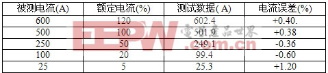 在系统中,我们设计光纤部分电流测试的额定电流为500A,额定电压为50kV,用该虚拟仪器系统对光纤感应电流进行测量。用变压器模拟大电流,通过虚拟仪器进行数据处理,得到的比差数据见表1: