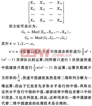 为提高图像处理速度采用一种快速中值滤波的算法,设n×n个像素方形滤波窗口为: