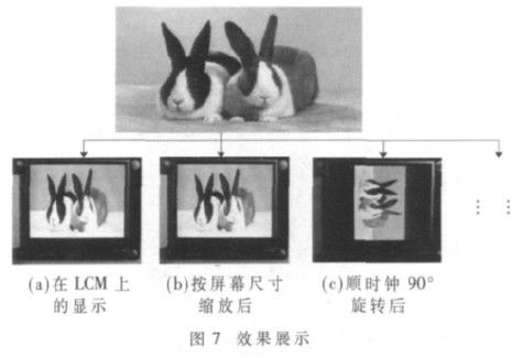 图7中,上方是分辨率为800×400的JPEG源图像;图7(a)为LCM上显示的效果图,该图经过缩小以适应屏幕的分辨率,此时的分辨率为320×160,居中显示,背景为黑色;图7(b)为按照屏幕尺寸缩放效果,此时分辨率为320×240;图7(c)为顺时针90°旋转后的显示效果,此时图像分辨率为120×240。