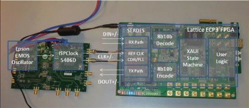 Epson CMOS振荡器的工作频率为78.125MHz,用作ispClock 5406D的参考时钟。ispClock 5406D通过编程以4倍的参考频率即312.5MHz,用作使用LatticeECP3 FPGA实现的XAUI设计的时钟源。使用片上ECP3的CDR/PLL块,实现了超低抖动、频率为312.5MHz 10倍的参考时钟。3.125GHz时钟分配给高速的XAUI 功能部分:SERDES的接收器(RX)和发送器(TX)块以及8b10b解码和编码块。
