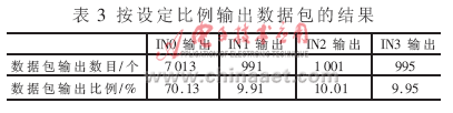 使Sender0生成10 000个随机数据包,得到如表3所示的结果。可以看出:每个输出端口输出数据包数目的比例与设定比例基本一致。