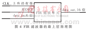 实现FIR滤波器的最上层的原理图如图4所示,输入16个8位数据data_in={1,-1,3,2,2,-1,1,-1,1,-1,3,2,2,-1,1,1}。