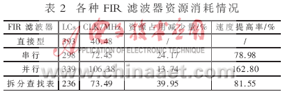 为了分析改进型FIR滤波器在FPGA中实现的特点,利用VHDL语言程序分别设计了16阶的串行、并行及直接型FIR滤波器,并与相应的拆分查找表法FIR滤波器进行比较,其各自的运行速度及占用FPGA资源的情况如表2所示。