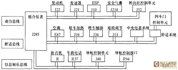 之间的网关 6 奥迪A4-B6控制器局域网中网关的应用 6.1奥迪A4-B6控制器局域网中网关的功能 由于几种数据总线的传输速率不同,所以系统之间不能直接进行数据交换。而事实上,在车辆处于正常工作状态时,不同的总线系统之间是需要有信息交流的,如发动机系统(动力总线)与空调系统(舒适总线)之间就有信息交流,发动机控制单元会将节气门开度、水温、转速等信号传给空调控制单元,而空调控制单元需将压缩机工作状态传递给发动机控制单元。为了解决此问题,特设置了网关,即Gateway,又称为网络适配器。它能把各种总线系统的传输速度转换成一个中间频率,从而使所有连接在CAN总线上的控制单元之间都能进行信息交流,整车的CAN总线系统就形成了一个有机的整体,如图6所示。 在奥迪A4-B6轿车上,Gateway只起到交换各种总线信息的作用,这种Gateway称为数据Gateway。而在Bora车上,Gateway除起到交换信息的作用外,还能在不改变数据的前提下,将动力总线、舒适总线和娱乐总线上的自诊断信息传递到K线上,这样可以使系统进行自诊断的速度加快。 6.2奥迪A4-B6控制器局域网中Gateway的适配 当更换某条CAN总线上的某个控制单元后,需进行该条CAN总线的适配,其目的在于使Gateway认识此新的控制单元并对其进行数据转换,否则该控制单元将不能参与CAN总线工作。每条CAN总线的每个控制单元都有一个固定的代码数值,适配时需将CAN总线上所有控制单元的代码数值加起来,输入总和数值到适当的通道,则该CAN总线适配成功,如果去掉某一控制单元的数值,则该控制单元无法参与CAN总线工作。如果更换了组合仪表,由于Gateway安装在组合仪表里,所以3条Gateway总线都需进行适配。但例外的是安全气囊控制单元,它不用编码,即不在适配范围之内,直接更换即可。 动力总线的适配:用VAG1551或VAS5051进入地址码“17”(仪表),然后选择“10”功能(适配),进入“060”通道,输入相应数值后“确认”即可。各单元数值:发动机为1,变速器为2,ESP为4,组合仪表为1024,如果该车是手动变速器,则适配时应输入“1209”。 舒适总线的适配:进入“061”通道输入各控制单元代码数值:汽车控制单元:勾l,舒适系统控制单元为2,组合仪表为256.转向柱控制单元为1024,空调系统为2048.驻车加热为32768。 信息娱乐总线的适配:进入“062”通道输入各控制单元代码数值:收音机为l,电话为2,电子导航为4,组合仪表为16。 图6 奥迪A4-B6轿车CAN系统示意图