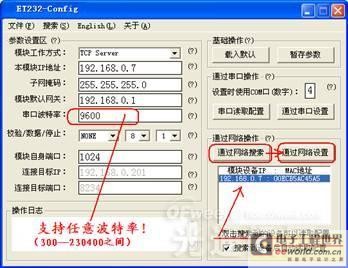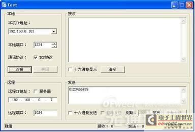 2、如果要查看或修改参数则运行Config.exe程序(界面如下左图),Test.exe用于测试以太网口与串口之间的数据收发(界面如下右图) :