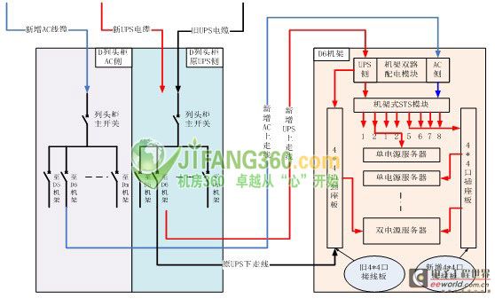 完成上述机架内部割接和机房内上下走线的割接后,所有的服务器负载均受UPS和AC的双重保护,而后再进行UPS设备的在线改造和割接工作,系统将受到足够冗余的保护,即便出现偏差,对业务影响的风险也可降至最低。