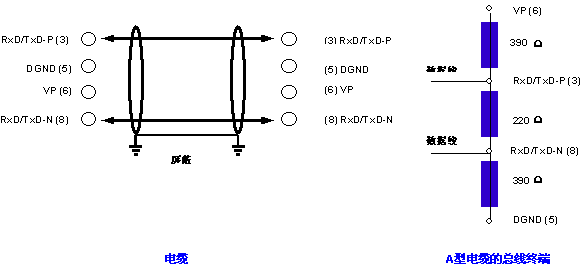 ·介质:屏蔽双绞电缆,也可取消屏蔽,取决于环境条件(EMC)。