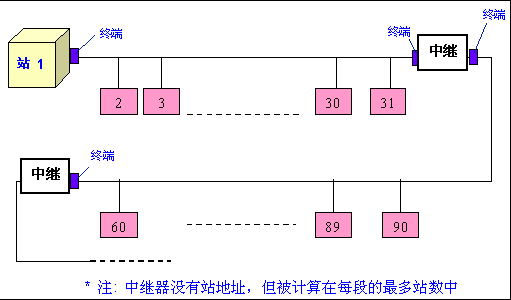(4)当分段站超过32个时,必须使用中继器用以连接各总线段。串联的中继器一般不超过3个。见图2-3所示: