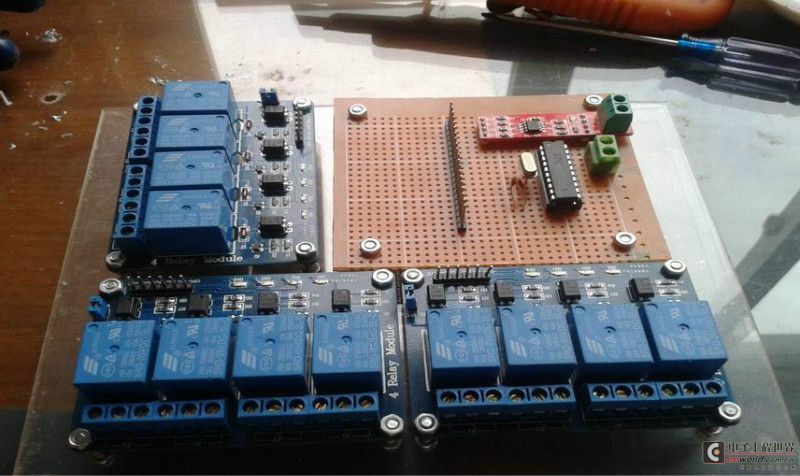 使用电脑进行控制单片机,由单片机控制继电器,再控制接触器达到控制大厅照明的目的。