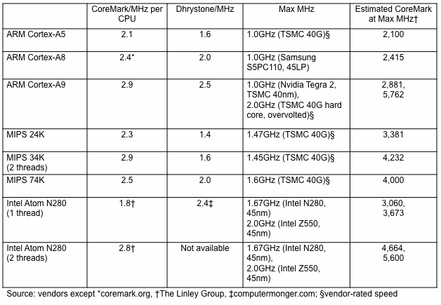 从Intel投入的精力和一些列的动作我们可以看出Intel向弥补自己在移动计算领域缺席的决心,但是从时间上来看,intel同ARM相比起步晚太多了,所以至今为止,除了上网本有采用Atom架构的处理器外其它移动计算设备很少有采用Atom处理器的(Nokia的MeeGo平台也许算是一个吧)。Intel的Atom在移动计算市场上的劣势还不仅仅存在于起步太晚上。 这不是Atom处理器流水线的全部。Atom处理器还含有两级预先译码部件(Predecoder)。因为传统的x86指令并不等长,而是16b~120b不等的,Predecoder部件的作用是划分指令边界,然后将其导入L1指令Cache。因此虽然Atom处理器L1指令Cache的大小为36KB,而实际可利用大小仅为32KB,剩余的4KB用来存放SOI(Start of Instruction),EOI(End of Instruction),等一些TAG信息。Atom处理器可以直接处理多数CISC指令,但是仍然有一些过于复杂的CISC指令被分解为若干个μops,再进入指令流水线。但是Atom处理器的流水线并非没有可取之处,这颗处理器可以直接执行ALU/Memory指令。这类指令首先被分解为ALU和Memory两个微操作,然后成对进入流水线,虽然Memory操作仍不能先于ALU操作执行完毕,也明显提高了这类指令的执行效率。为了弥补没有使用乱序执行的缺憾,Intel的设计人员采用了Intel一向很称道的HT(Hyper-Threading)技术,即超线程技术,这种技术能够显著提升系统的响应性。因为它的主要设计理念是,在一个物理CPU上实现了两个逻辑的CPU,这两个逻辑的CPU拥有自己独立的寄存器组还拥有独立的APIC(Advanced Programmable Interrupt Controller)等其它资源,但是它们共用一条流水线,在一条线程由于执行某种耗时操作而挂起的时候,另一个线程的代码可以使用这条流水线,同时它们可以同时跟踪自己的中断,而互不干扰。 Intel工程师们为了实现向前兼容,还不得不放弃很多最新的、优秀的芯片设计方法。从而使得Atom处理器有一种背负历史使命的厚重感,少了一些现代的轻盈与高效。但是我们也看到,Atom处理器最开始是跑上网本的,也正是由于其一直秉承的向前兼容理念使得上网本上可以安装xp或者linux系统,然而,在上网本上跑各种PC中的软件却让人愈发感觉Atom处理速度的不足。Intel拥有着这个星球上最顶尖的芯片工程师,但是他们的才智却被花在了解决x86那些乖张、荒谬的处理逻辑上。性能并不是Atom处理器的优势,并不出乎体系结构专家的意外,在许多Benchmark程序下,Atom处理器落后于Cortex A9处理器,如图2.8所示。而且Atom处理器的功耗与ARM处理器目前并没有可比之处。 图2.8 Atom与Cortex Benchmark性能测试对比 注释: System-on-Chip技术是一种高度集成化、固件化的系统集成