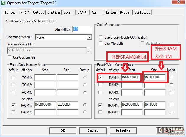 再编译的时候就会把外部SRAM的初始化编译进去,初始化的代码大家可以去看文件中的void SystemInit_ExtMemCtl(void) 这个函数。然后我们在工程设置那里把外部SRAM地址增加进去,如下图