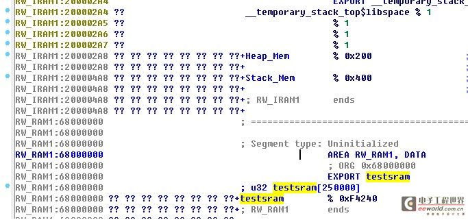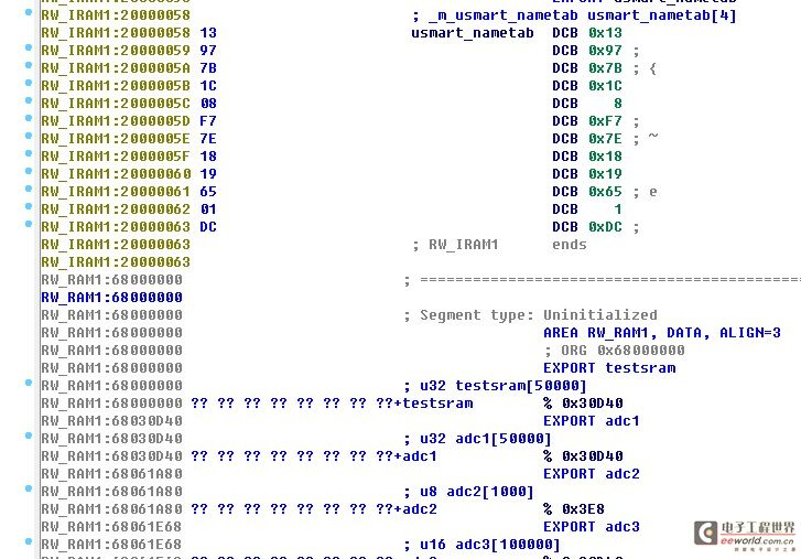 我们继续深入点,看看testsram[]这个大数组到处编译在到哪里去了,用IDA64来反汇编下编译出来的AXF文件