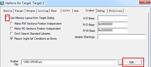 去掉小红框的勾,然后点击Edit我们来修改SRAM.sct文件,也就是编译散列文件