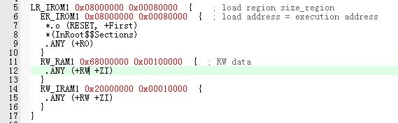 到这里相信大家会有一个疑问,那编译是怎么来决定把哪些变量定义在内部SRAM,那些定义在外部SRAM。这一点我也研究清楚,我只知道编译会优先把变量都定义外部SRAM,当外部SRAM不够用情况才会定义在内部SRAM上,至于怎么让编译优先使用内部SRAM,我也没有搞明白。目前我能做到的是把已经初始化的全局变量都放在SRAM,做法是修改散列文件,让RW只在内存SRAM上编译。