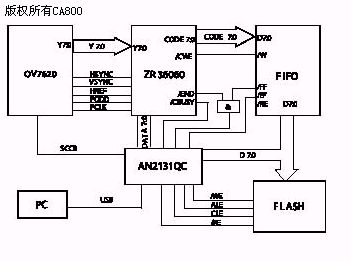 NAND式FLASH有可能存在坏块,这就要考虑物理地址和虚拟地址的对应问题,所以建立了一个对应关系表,并存在FLASH的头几个块中,该表不断更新,随坏块的增加而变化,同时还记录了数据的保存位置。这样在初始化时,可以直接读取图像数据分配情况。为了记录FIFO的数据,采用类DMA的存储方法。单片机先从[D7:0]口输入命令和计算的地址的串行信号,然后发出命令使能FIFO的RE输出并计数,当到达一页的数量512个字时,重新上述输入过程。