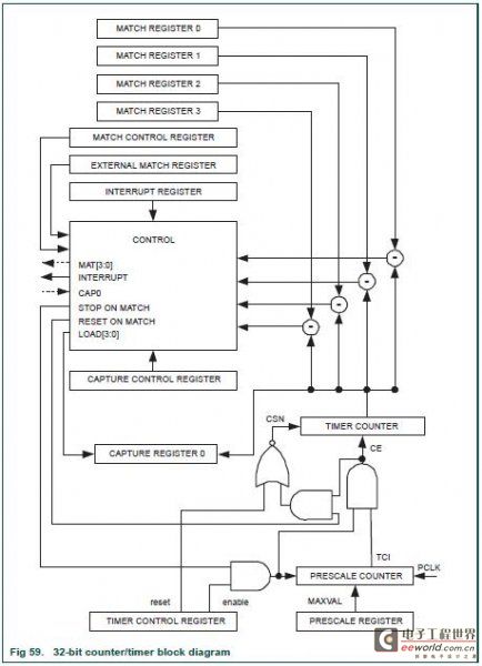 对于各定时器,最多4个匹配寄存器可配置为PWM,允许使用多达3个匹配输出作为单边沿控制的PWM输出。 注:除外设基址不同外,32位定时器/计数器0和32位定时器/计数器1功能相似。