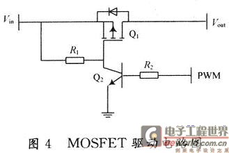 设计的控制器属于串联型,即控制充电的开关是串联在电池板与蓄电池之间的。串联型控制器相对于并联型控制器能够更有效地利用太阳能,减少系统的发热量。设计中用MOSFET实现开关。MOSFET是电压控制单极性金属氧化物半导体场效应晶体管,所需驱动功率较小。而且MOSFET只有多数载流子参与导电,不存在少数载流子的复合时间,因而开关频率可以很高,特别适合作为PWM控制充电开关。为此,设计中采用P沟道MOSFET。P沟道MOSFET的导通电压Vth<0,由图4可以实现MOSFET的驱动。当Q2导通时,由于Q2的Vce很小,可以认为Q1的G极接地,Vgs<0,当Vin达到一定值时,Q1导通。