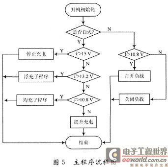 主程序主要完成对I/O、定时器和PWM的初始化,同时根据电池板和蓄电池的状态调用相应的充放电子程序。控制器参数的测量主要由中断服务程序完成。