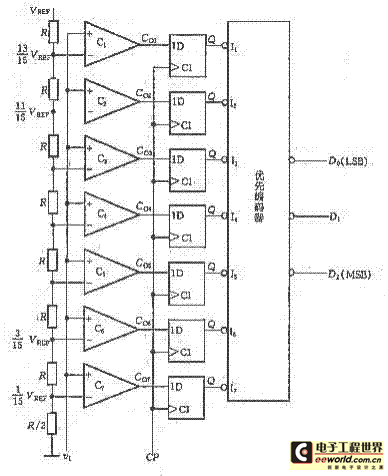 得到从1/15Vref~13/15Vref之间的7个比较电平,量化单位为2/15Vref. 然后将要输入的模拟电压同时加到