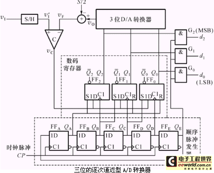 C为电压比较器,当Vi>=Vo时,比较器输出为0;反过来输出为1. FFa,FFb,FFc三个触发器组成了三位数码