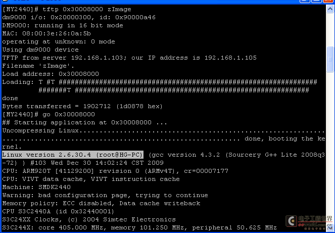分别重新编译u-boot和kernel。u-boot下载后,记得要saveenv;kernel用tftp下载到内存后使用go命令来测试引导内核,结果可以引导了,如下: