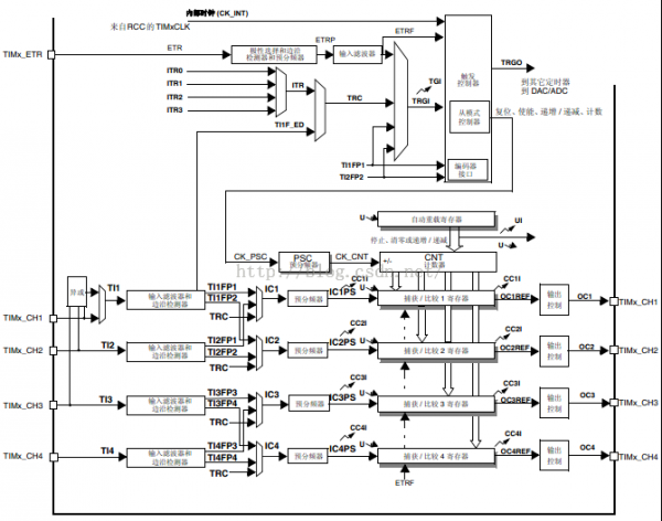 由图中可以发现时钟来源有:1、内部时钟(CK_INT)。2、外部时钟模式1;外部引脚TIx,由输入捕获部分产生。3、外部时钟模式2;外部触发输入ETR。4、内部触发输入ITRx,该时钟是由另一个定时器输出产生的,对应到框图中的TRGO。经过相应的选择后产生时钟CK_PSC。