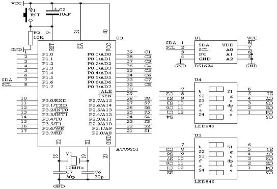 (1).由于DS1624是I2C总线结构的串行数据传送,它只需要SDA和SCL两根线完成数据的传送过程。因此,我们在进行程序设计的时候,也得按着I2C协议来对DS1624芯片数据访问。有关I2C协议参看有关资料,这里不详述。对于AT89S51单片机本身没有I2C硬件资源,所以必须用软件来模拟I2C协议过程。