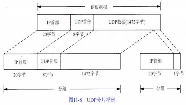 端到端的传输单元(在分片之前和重新组装之后) ,分组是指在IP层和链路层之间传送的数据单元。一个分组可以是一个完整的 IP数据报,也可以是IP数据报的一个分片。(这里有如何分片的说明,书里介绍的详细,简而言之,超过MTU就需要分,但是第一片和接下来的片是有区别的:第一个有UDP首部,其他没有,但是可以通过IP的flags来组合起来。下面的图很形象的说明了。)