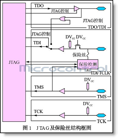机,禁止J TAG功能的途径是将单片机内部的加密保险丝熔断,熔断后的单片机就无法再使用JTAG功能,从而达到加密程序代码的目的。具体的JTAG及加密保险丝结构框图如图1所示。