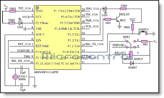 熔断加密器的硬件采用了MSP430F1111A作为系统芯片,实现对目标JTAG口的通信控制、熔断电压V pp的加载与分离、目标MSP430 单片机中保险丝熔断指令的控制。在电源部分,熔断电压V pp 及100mA的熔断电流是在7806三端稳压芯片与地之间串接二极管IN4001来实现的;熔断电压Vpp的加载与分离通过继电器的通断来实现,并使用了3 个