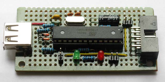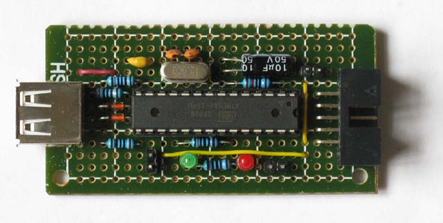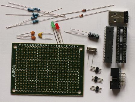 元件准备好后,先得检测下质量,电阻的阻值、发光管的极性、电容是否有短路。要测试下两个稳压管的稳压值是否正确。最最重要的是先把USB接口用延长线接到PC上,然后用万用表测一下正极在哪,做个标记,这样就能搞清楚了D+、D-的位置,也不会接反电源了。免得焊好后发现错了极性反复焊,焊盘很容易脱落,也避免接反烧了元件。(我开始用的是USB公头接口,后来发现在板子上吃不上劲,稍一用力很可能会松脱。所以换成母口了)