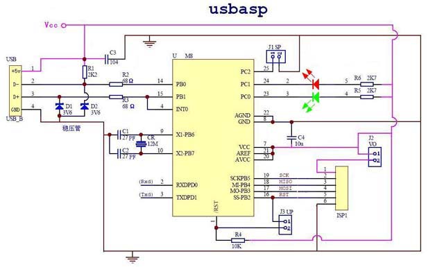 第一、电源题:原先的并口下载线是靠S51板上来供电的,也就是说当你焊好你的USB-ISP板后给它装固件时,USB-ISP板得向原并口下载线供电,而固件装好后USB-ISP板就是靠PC的USB口向我们的USB-IS板供电了,而你以后的51实验板就不能向这个USB-ISP板供电了,否则PC和51实验板都向USB-ISP供电,那么电压不同就有可能烧坏PC口或元件的。因此J2跳线就是为了区别装固件和正常下载而使用的。装固件时另附电源加在USB-ISP上,J2短接,可以过J2口向原来的并口下载线供电。当正常使用时,USB-ISP板上的附加电源撤掉,由PC的USB口供电,将J2断开,隔离开USB-ISP板和51板电源。