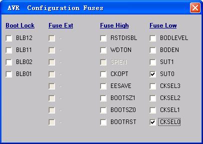 果然,我点了下Read,居然能正常读取了,于是我点Open file然后选择网上下的那个11K大小的main.hex,点击Write接下来就是写程序和校验一切OK。然后点击Fuse Bytes(熔丝字节),在下图的SUT0和CKSEL0前点上勾,
