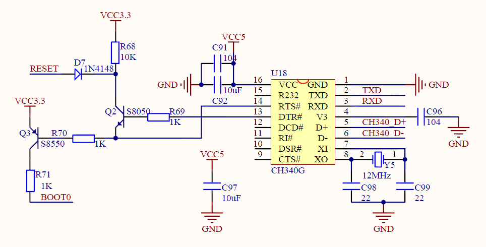 在画PCB初期原理图部分,对采用CH340G设计的一键下载电路不甚了解,于是花了一些时间来研究一下这个电路。