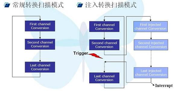 规则转换和注入转换均有外部触发选项,规则通道转换期间有DMA请求产生,而注入转换则无DMA请求,需要用查询或中断的方式保存转换的数据。