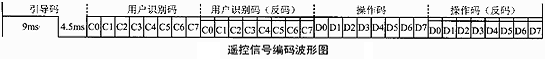 遥控器发射的信号由一串O和1的二进制代码组成.不同的芯片对0和1的编码有所不同。通常有曼彻斯特编码和脉冲宽度编码。TC9012的O和1采用PWM方法编码,即脉冲宽度调制,其O码和1码如图1所示(以遥控接收输出的波形为例)。O码由O.56ms低电平和0.56ms高电平组合而成.脉冲宽度为1.12ms.1码由0.56ms低电平和1.69ms高电平组合而成.脉冲宽度为2.25ms。在编写解码程序时.通过判断脉冲的宽度,即可得到0或1。