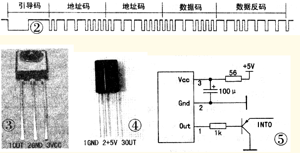 红外遥控接收可采用较早的红外接收二极管加专用的红外处理电路的方法。如CXA20106,此种方法电路复杂,现在一般不采用。较好的接收方法是用一体化红外接收头,它将红外接收二极管、放大、解调、整形等电路做在一起,只有三个引脚.分别是+5V电源、地、信号输出。常用的一体化接收头的外形及引脚见图3和图4。红外接收头的信号输