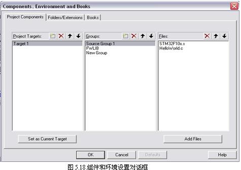 除了添加文件,我们还可以添加新的Group,操作和添加文件类似,出现下拉菜单之后我们选择“New Group”,这时就会在工程窗口看到新加的Group。对Group和添加文件的操作我们还可以通过点击工具栏上的彩色品字按钮进入“Components,Environment and Books”窗口,如下图所示。